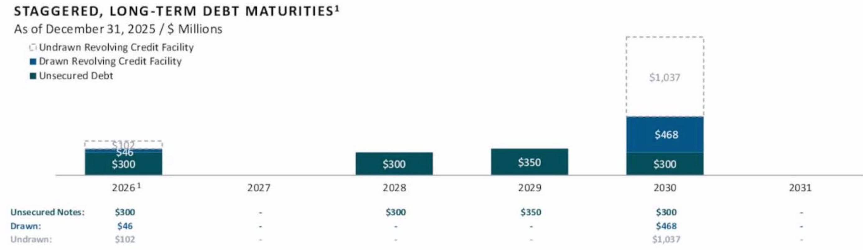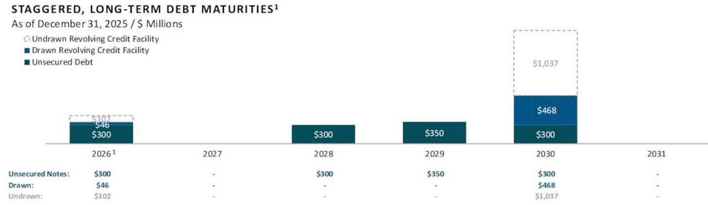 Liquidity is also strong, with over $1.1 billion in available capacity. Near-term debt maturities are limited, and the next major maturity after August isn’t until 2028.