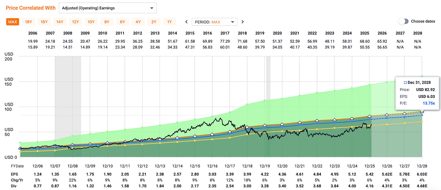 Management guided to 2026 EPS of $5.56–$5.72, representing ~4% growth year-over-year. While modest, combining mid-single-digit earnings growth with a near-7% yield creates a clear path to double-digit total returns — especially if buybacks continue at the current pace.