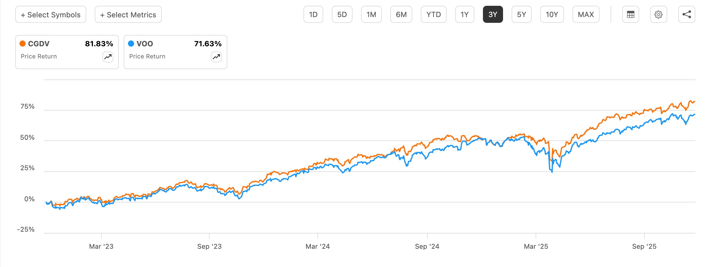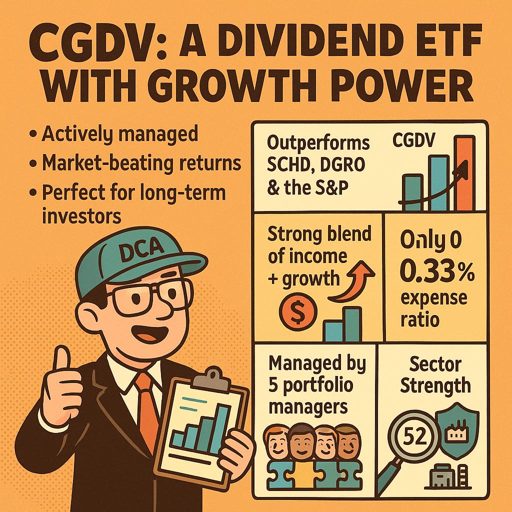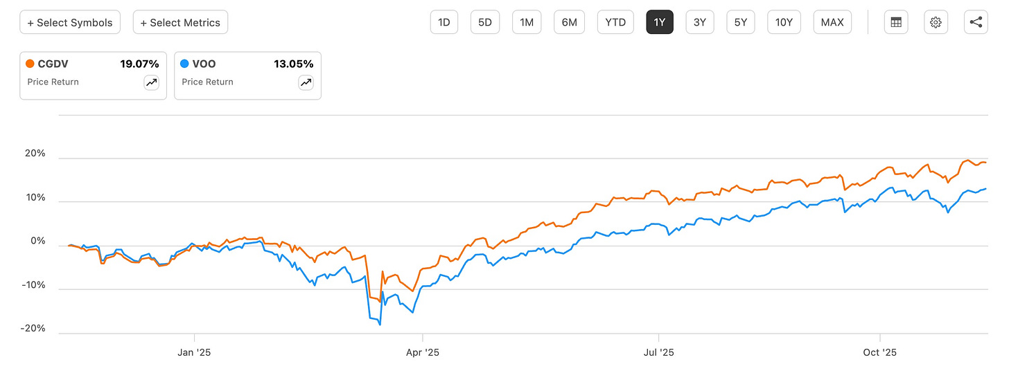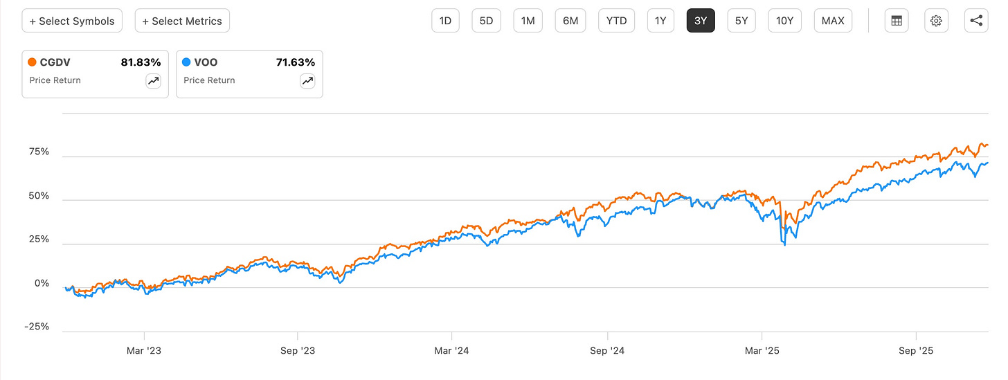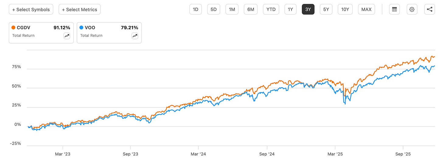 Despite its short history, CGDV’s blend of dividend-paying companies and growth exposure has allowed it to beat Schwab US Dividend Equity ETF (SCHD), iShares Core Dividend Growth ETF (DGRO), Schwab US Large Cap Growth ETF (SCHG), and even every investor’s favorite ETF, Vanguard’s S&P 500 ETF (VOO) over 1- and 3-year periods.