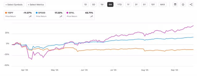 You can see in the chart below that their underlying holding, SPXL has performed exceptionally over the past 6 months, up close to 44%, compared to YSPY being down 11.37%.