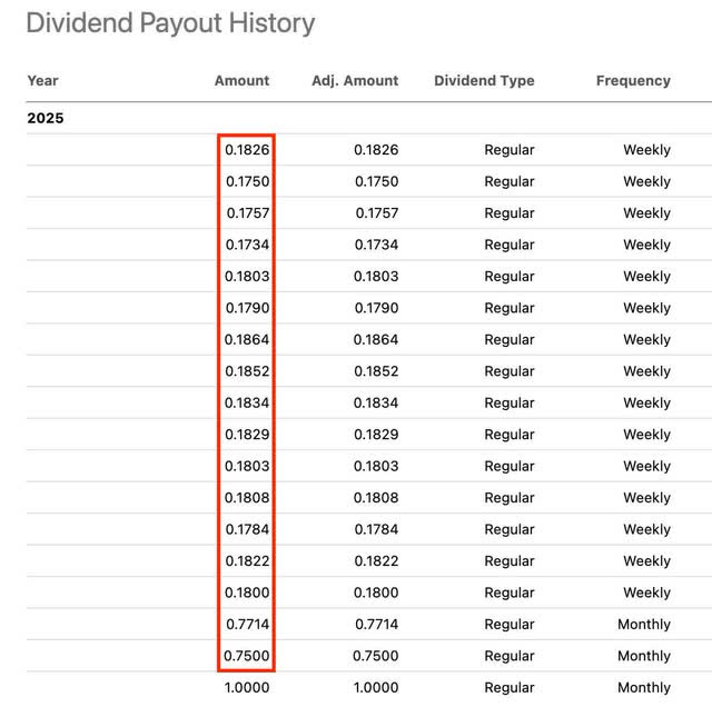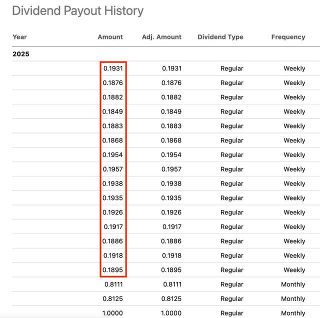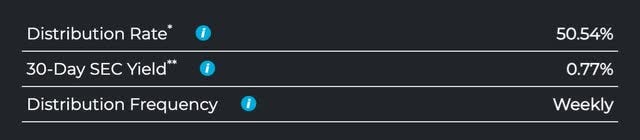 And going forward, this is likely something the fund could continue to experience. But their weekly distribution could also be the attractive trade-off. Below you see the fund has paid weekly distributions and as of earlier this month, had a distribution yield of 50.54%.