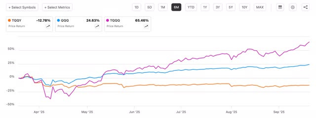 So, for income-oriented investors looking to own these funds, you also get diversification. Below you can see TQQY has expectedly underperformed both TQQQ and Invesco QQQ Trust ETF (QQQ) over the past 6 months.