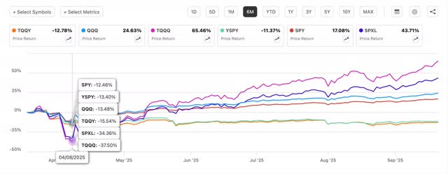 TQQY is down more than YSPY, 12.78% compared to 11.37% for YSPY. TQQQ has outperformed QQQ, up an impressive 65.46% vs 24.63% for the latter. But something I want investors to pay close attention to is that during the April Liberation Day crash, both YSPY & TQQY saw less of a decline than their underlying holdings.