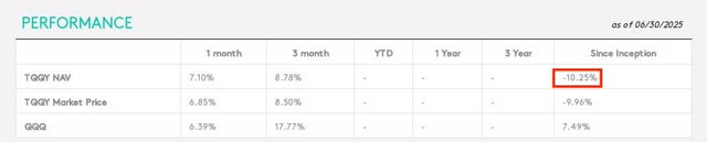 Expectedly, TQQY has experienced NAV erosion over the past 7 months, with its NAV down double-digits, while QQQ's NAV has grown 7.49%. As a result, TQQY's price has declined.
