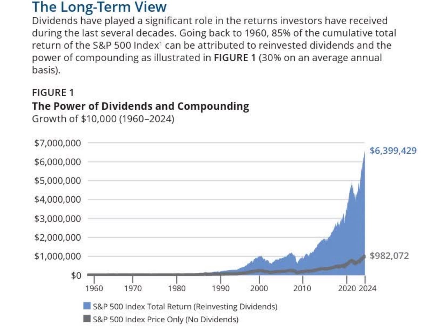 From 1960 through 2024, the S&P 500 (SP500) without dividends grew $10,000 into roughly $982,000.