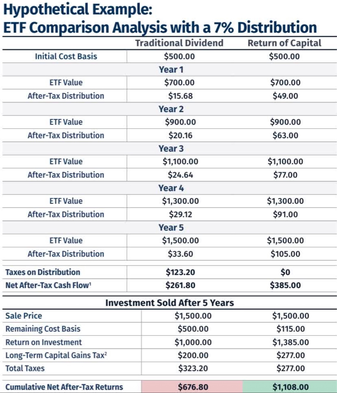 Return of capital defers your taxes until your cost basis reaches zero, or you decide to sell.