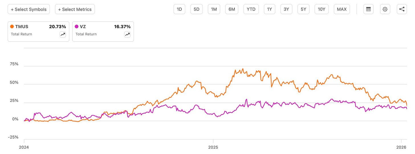 T-Mobile’s yield sits below 2%, while Verizon’s exceeds 7%. Yet over the same period: