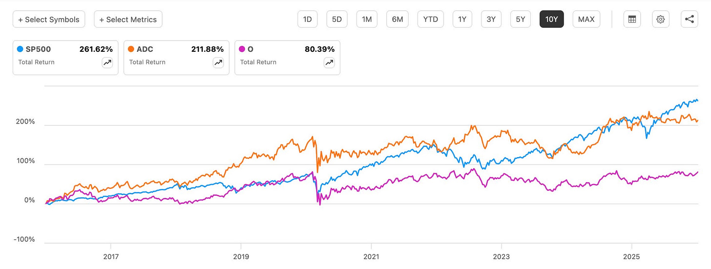 While Realty Income (O) is larger and more popular, Agree Realty (ADC) has delivered stronger long-term total returns due to: