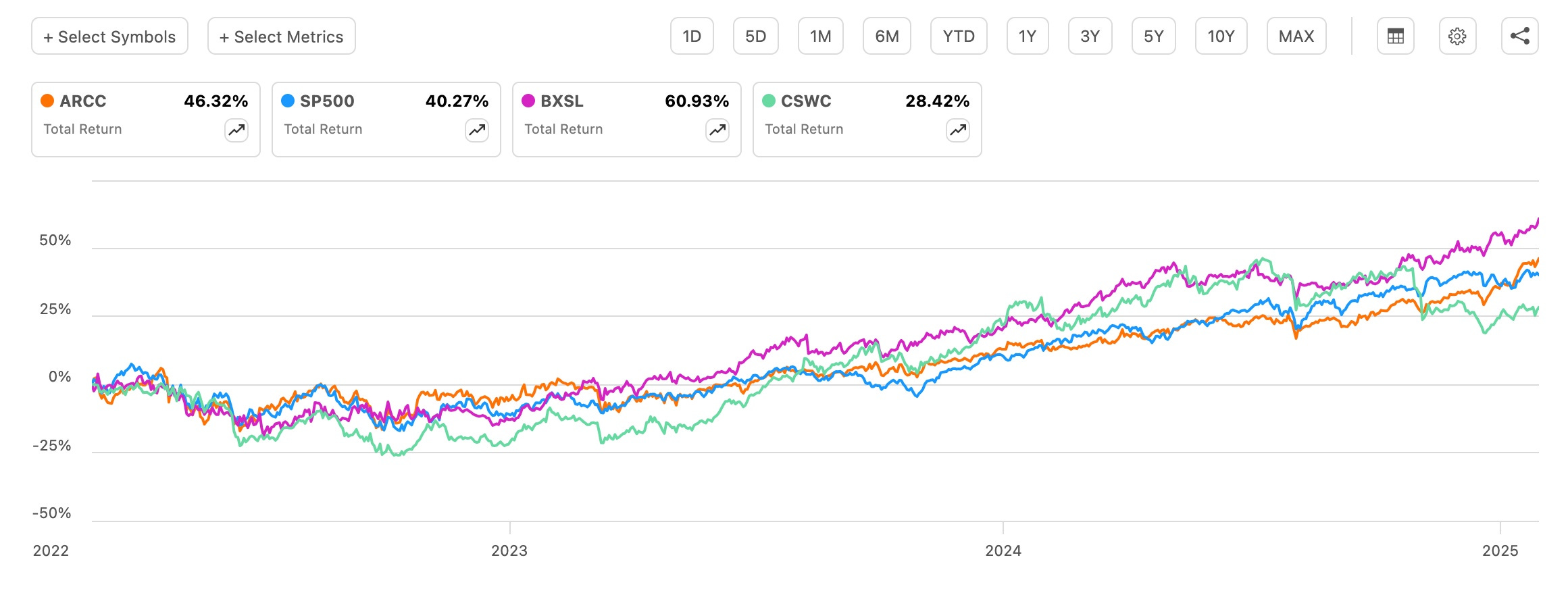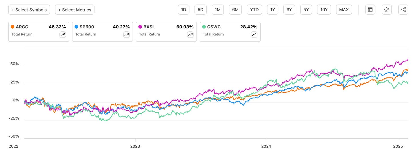Including dividends, ARCC outperformed the index, up 46.32% compared to 40.27%. My third favorite BDC, Blackstone Secured Lending (BXSL) outperformed the entire group, up nearly 61%. Capital Southwest (CSWC) also performed well.
