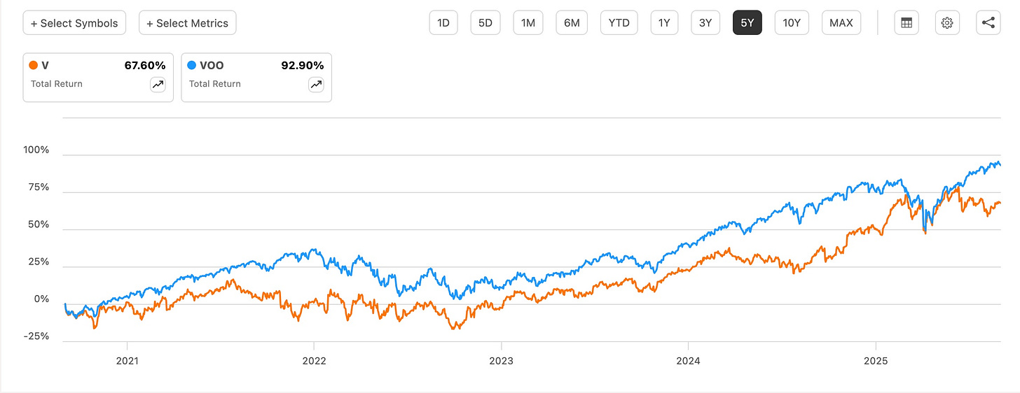 Below you can see over the past 5 years Visa has underperformed everyone’s favorite ETF, Vanguard’s S&P 500 ETF (VOO) in total returns, up 67.60% compared to 92.90% for the latter.