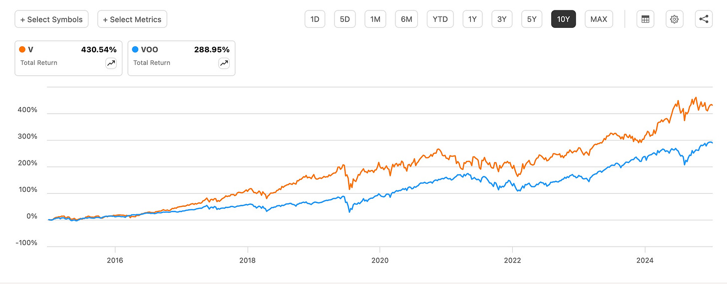 But over the longer-term, Visa has significantly outperformed the ETF, up 430.54% compared to 288.95%, showing why they’re one of the best long-term stocks for growth. This also shows why stocks are better held for the long run.