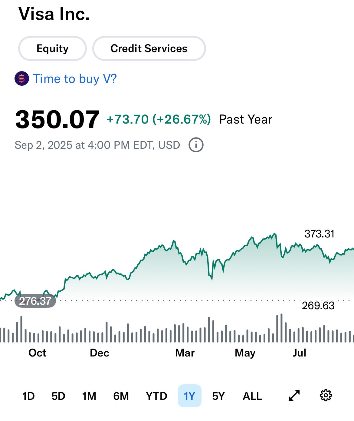 But today I want to discuss why I own Visa. Currently, Visa is one of my largest positions in my portfolio by cost basis. In the chart below you can see Visa is up 73.70% in the past year.
