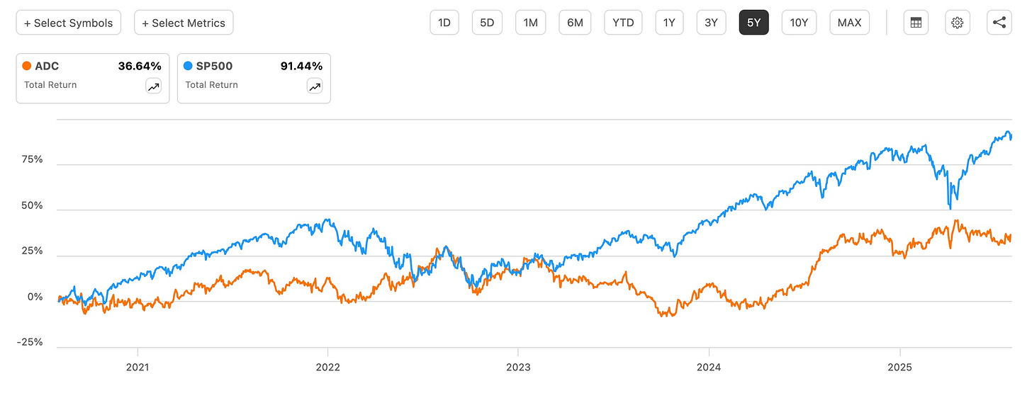 Below is a 5-year chart of the total returns of Agree Realty vs the S&P (SP500). The S&P significantly outperformed ADC in total returns, up 91.44% compared to just 36.64% for the latter.