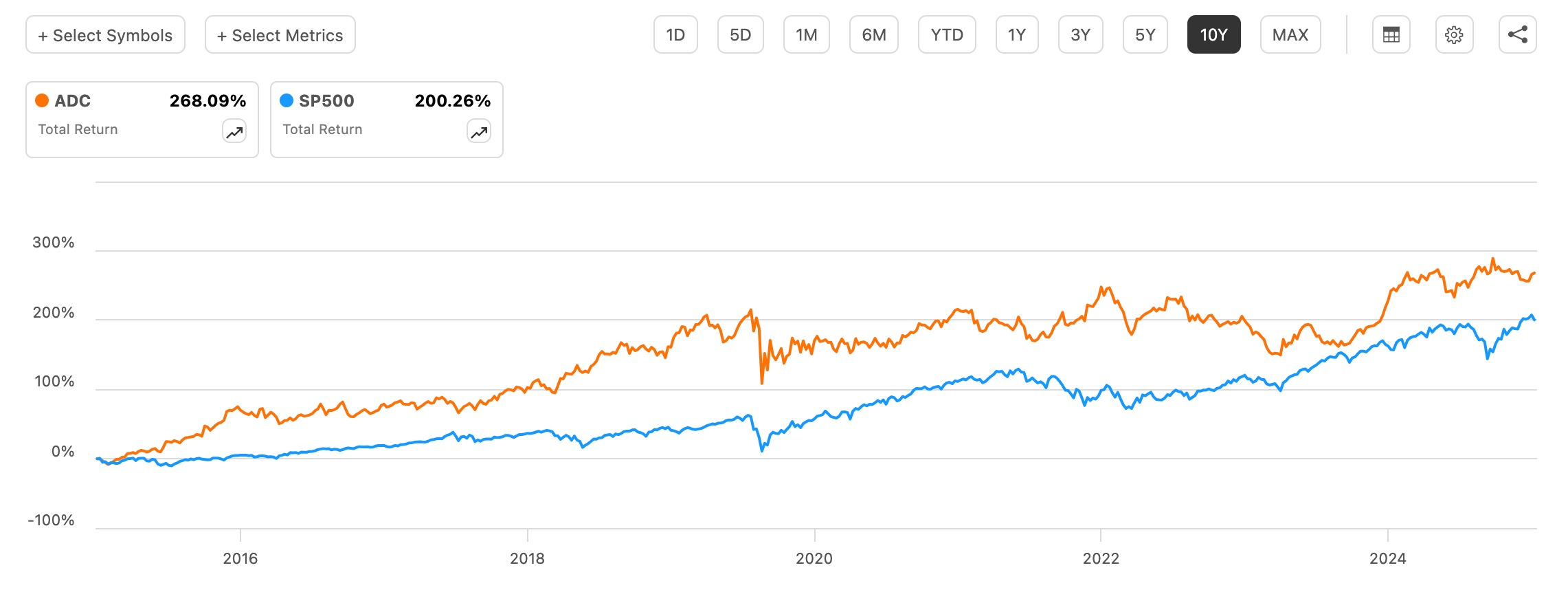 But over a 10-year span Agree Realty has outperformed the index, up over 268% compared to 200% for the S&P.