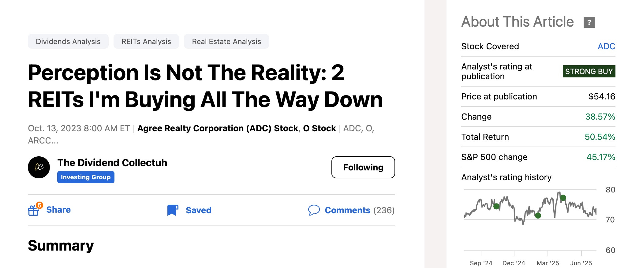 But many investors can’t put their money where their mouth is. As Warren Buffett famously said: Be fearful when others are greedy and greedy when others are fearful. Back in October of 2023, I wrote an article on REITs Agree Realty (ADC) and Realty Income (O).