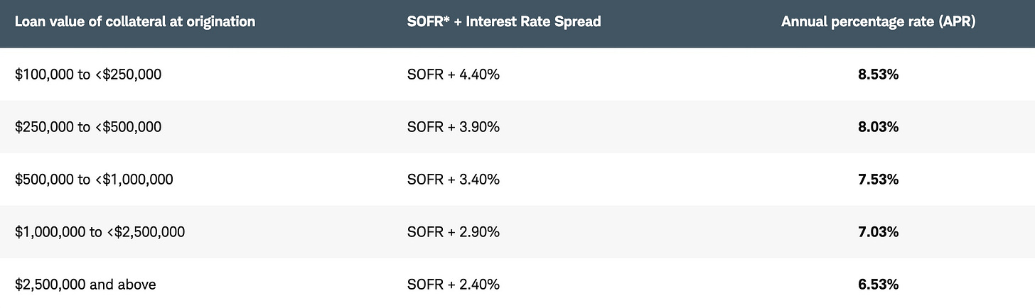 Below are the current interest rates for a Pledged Asset Line with Charles Schwab. As mentioned previously, the more your borrow, the lower your interest rate will be. Once short-term interest rates come down, these will drop in tandem.