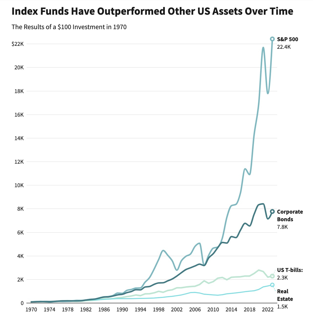 Below is a chart of how index funds have performed vs real estate since 1970. A $100 investment in 1970 in an S&P 500 index fund would be worth $22,400 today. The same in physical real estate would be worth $1,500.