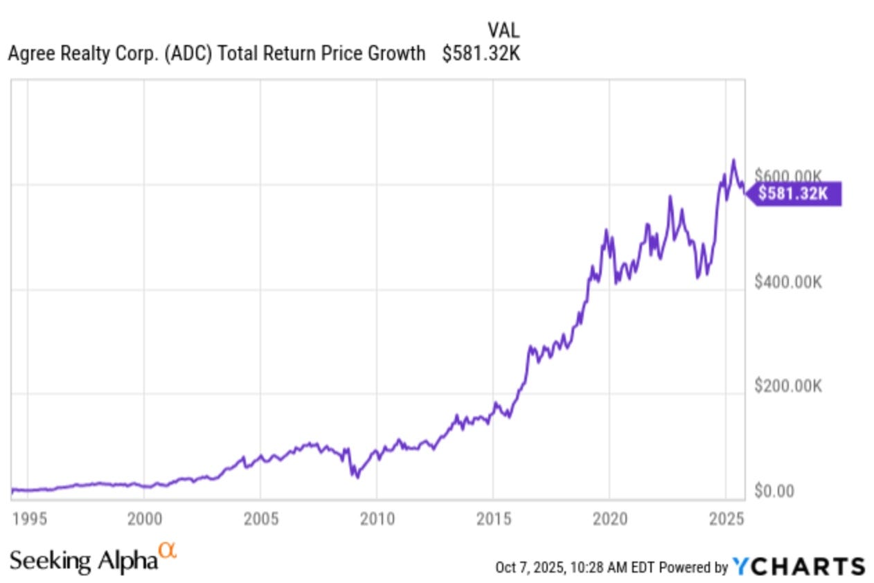 If you had invested $10,000 into ADC in 1994, it would be worth close to $600,000 today. No fees or property taxes, just collecting dividends every month. For a perspective, let’s say you had this same amount in cash from a property you sold. And invested that $581,320 into Agree Realty today.