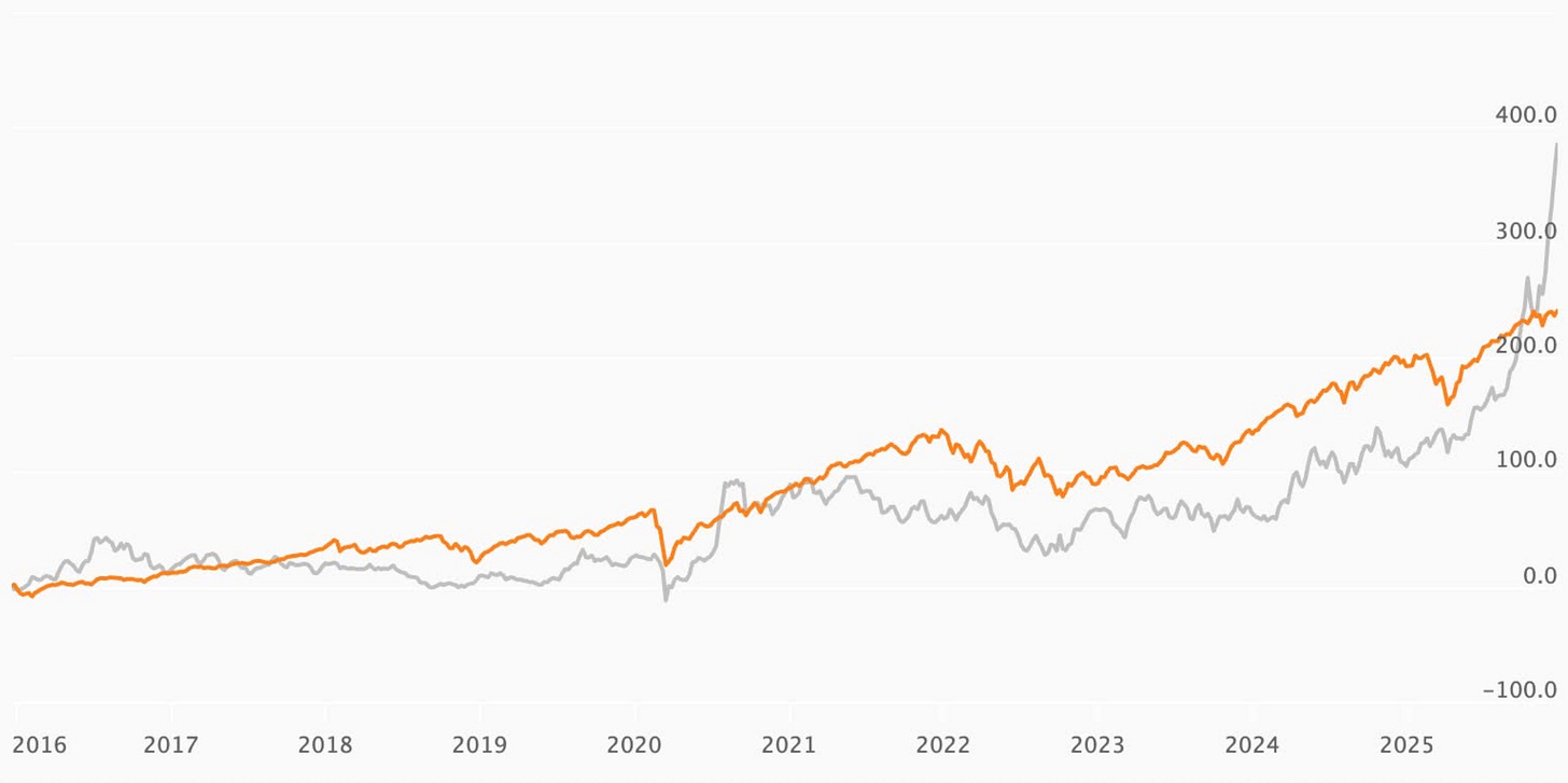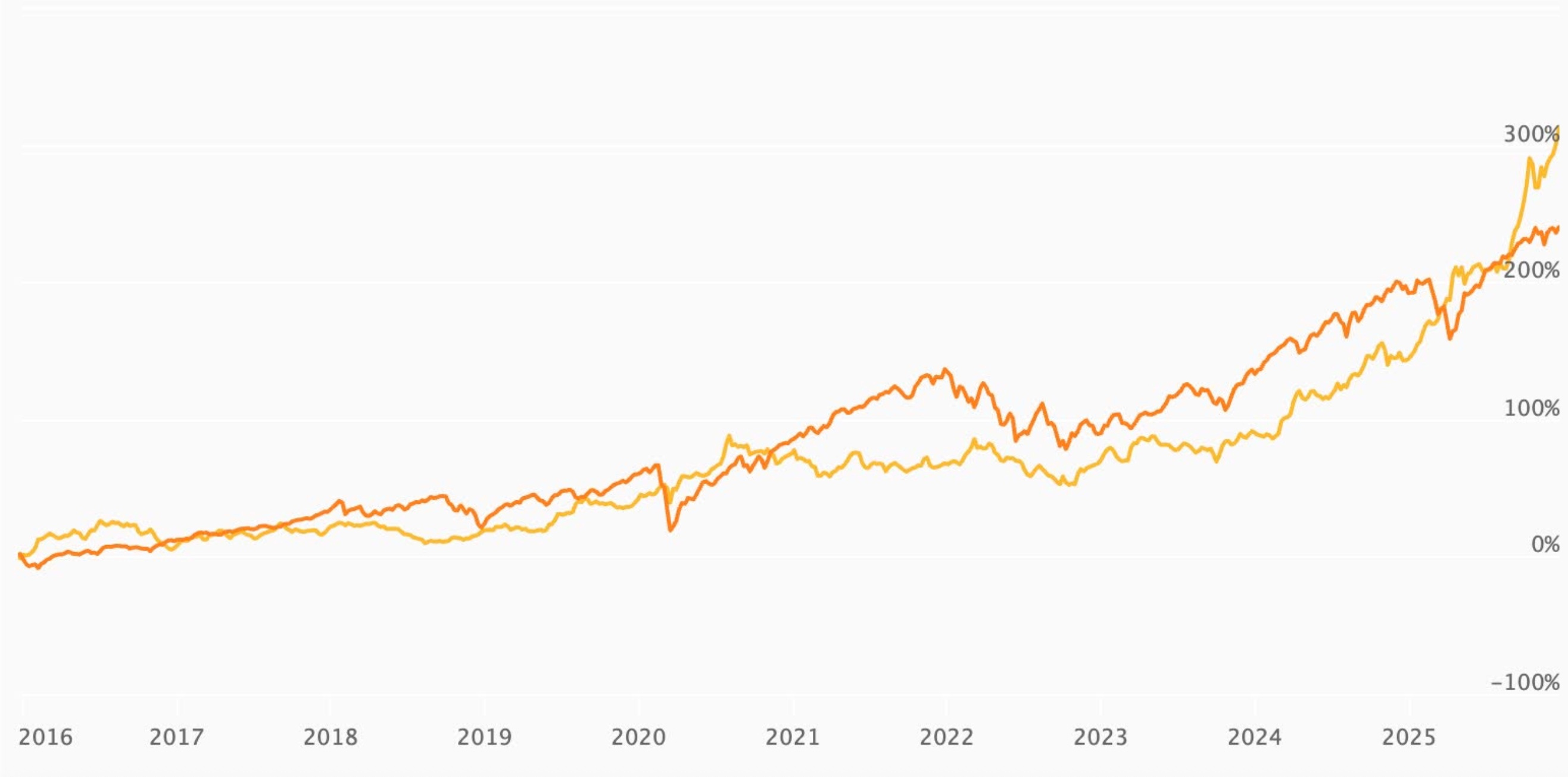 The chart below shows how Gold has performed vs the S&P in the past decade. You can see how 2025 gold has surged in performance.