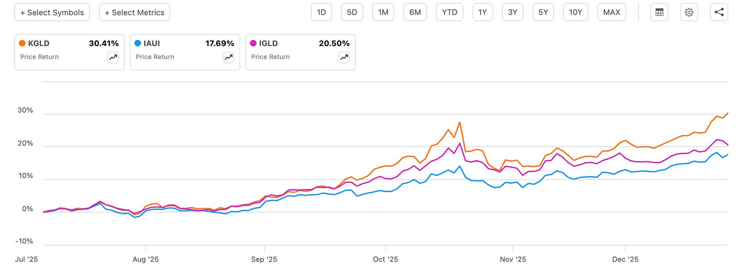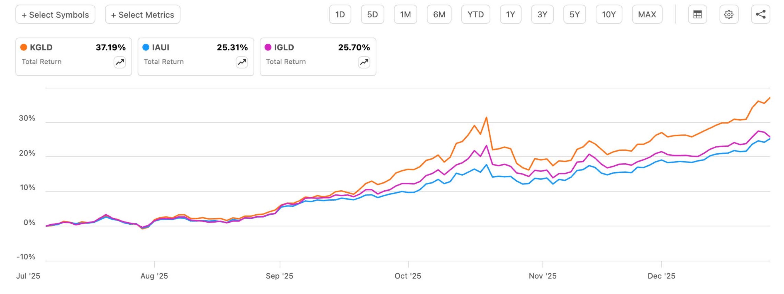 KGLD is up over 30%, compared to roughly 18% for IAUI and 21% for IGLD over the same period.