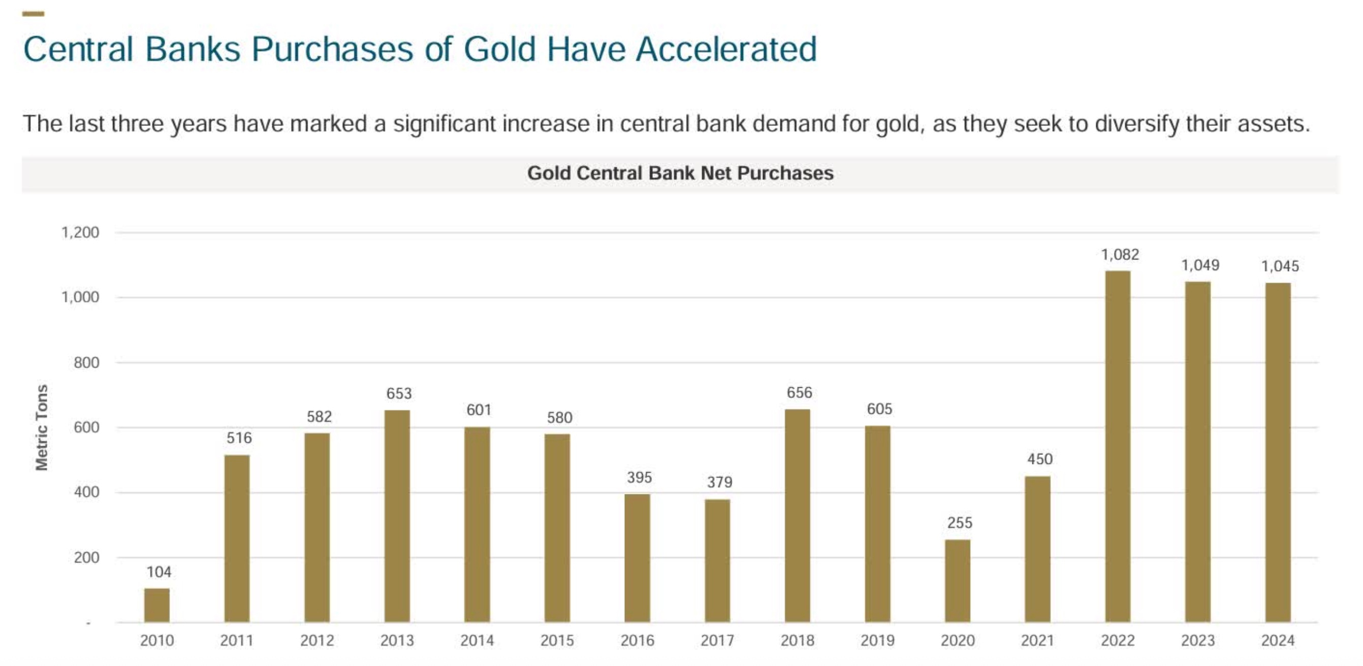Gold’s outperformance in recent years hasn’t been driven solely by economic uncertainty. One major tailwind has been aggressive central-bank buying. Since 2022, global central banks have been steadily increasing their gold reserves, reinforcing gold’s role as a monetary hedge.