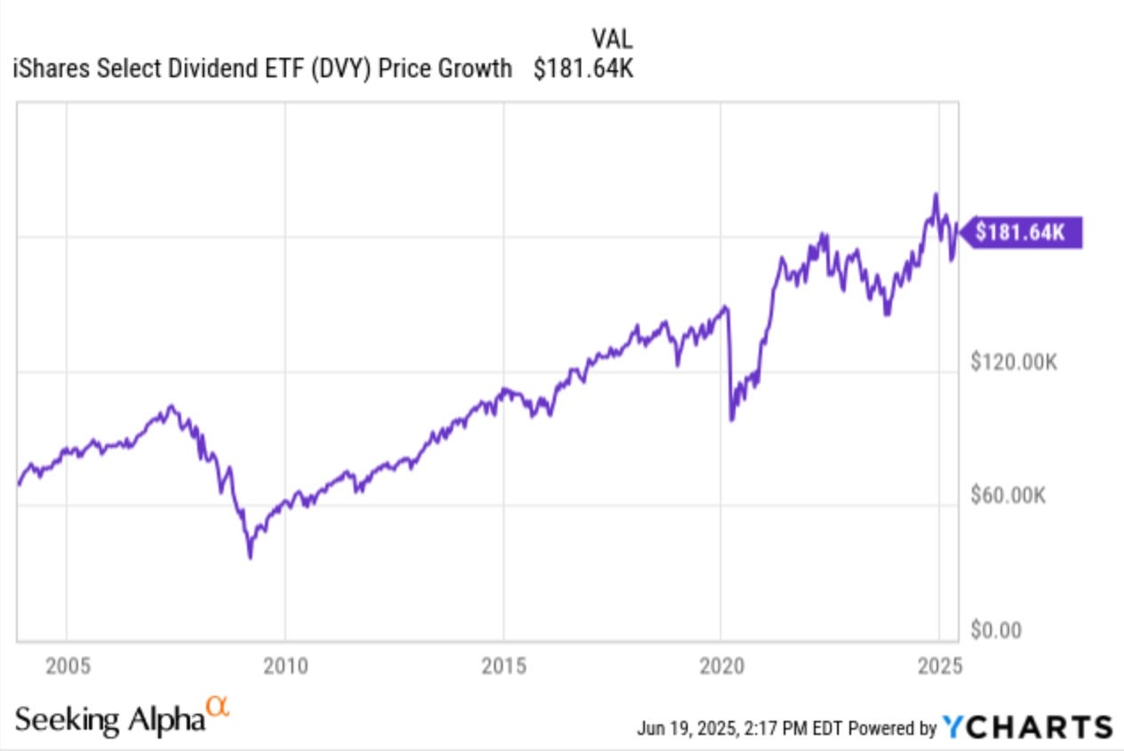 Placing the other half into a dividend-focused ETF like DVY would be worth almost $182,000. I used DVY because it is the oldest dividend-focused ETF with an inception date of November 2003, almost 22 years. So, this was relatively close for the scenario.