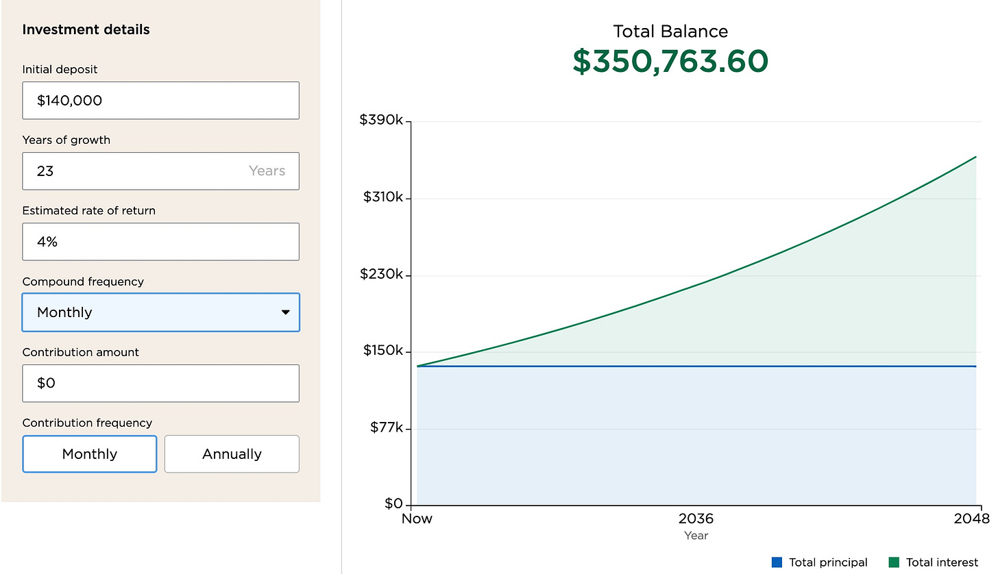Below is how much you’re expected to earn on your $140,000 investment over a 23-year period at 4%. I used this time frame because my friend is 36 years old and can legally withdraw tax free from a Roth IRA at 59 1/2.