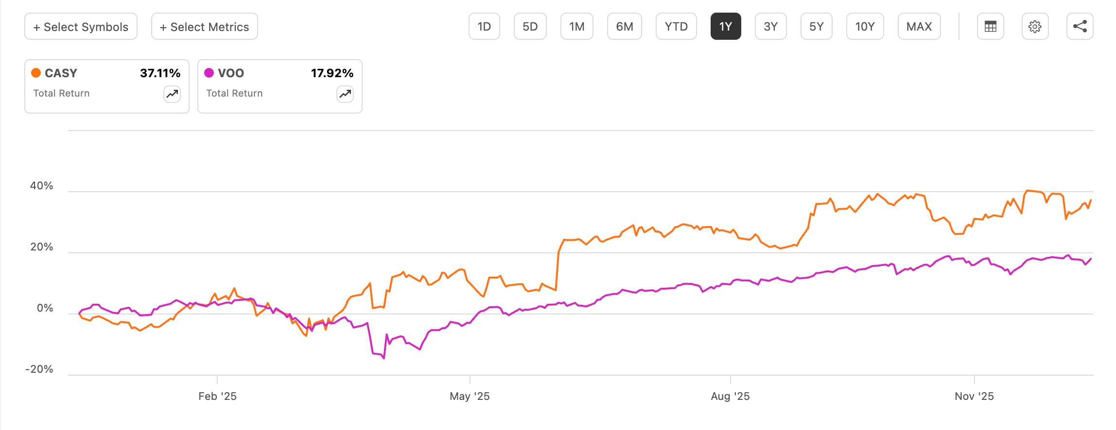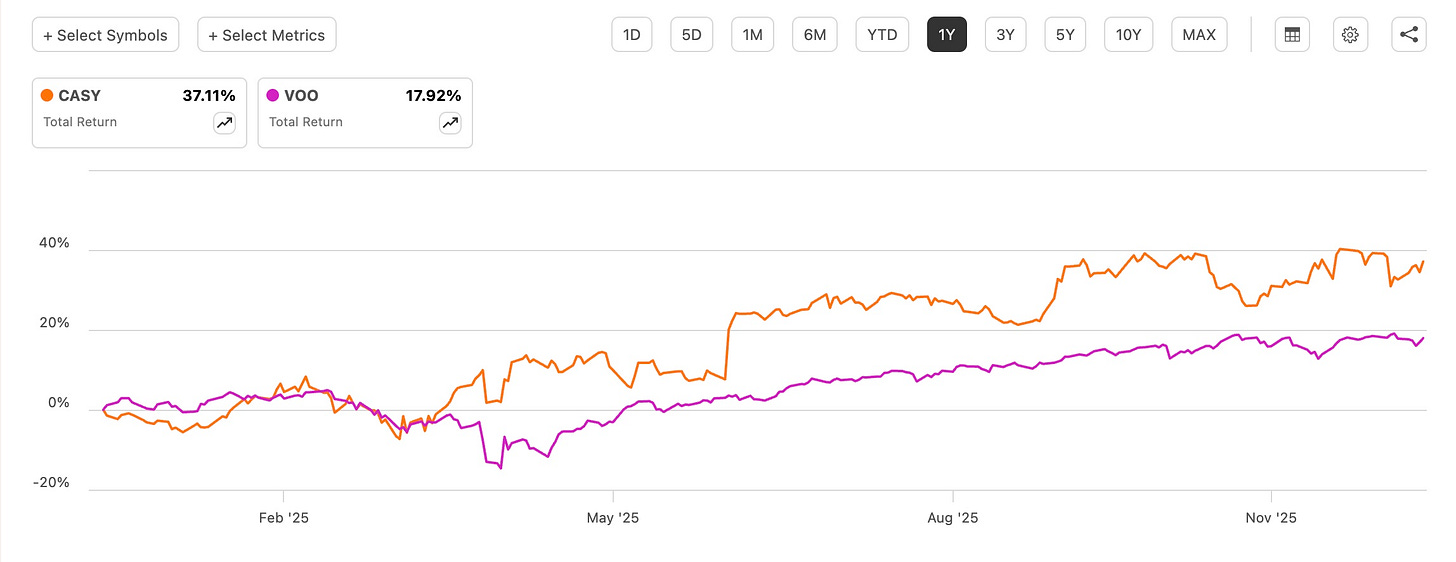 Since then, the stock has delivered. Casey’s has significantly outperformed the S&P 500 (SP500), rising more than 88% versus roughly 34% for the index. That level of performance is impressive.