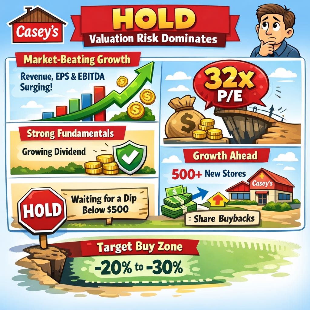 I maintain a HOLD rating on CASY. For new investors, patience is key. I would become much more interested in the stock following a 20%–30% correction, ideally at prices below $500.