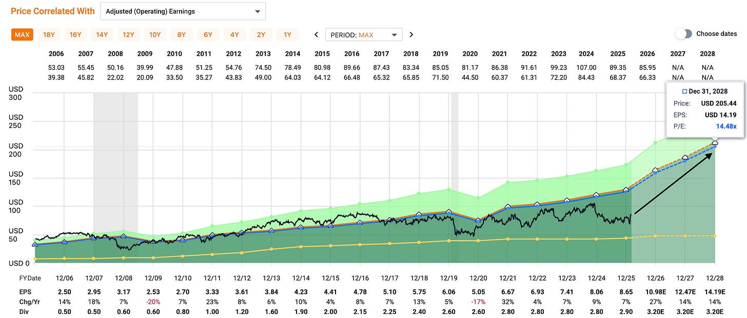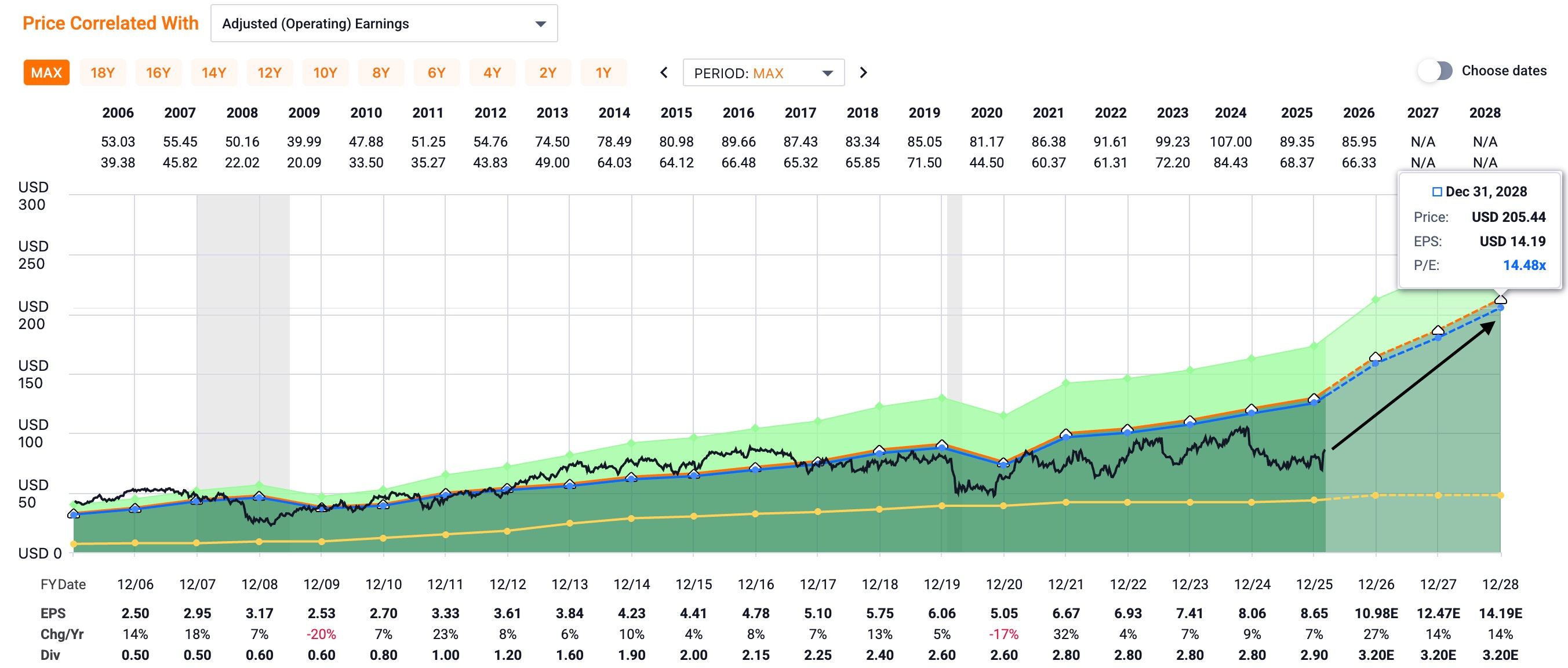 If rates decline and recession is avoided, a move above $100 by late 2026 is very achievable in my view. If the OMC can return to their historical average, upside potential is massive with a 2028 price target of $205.44.