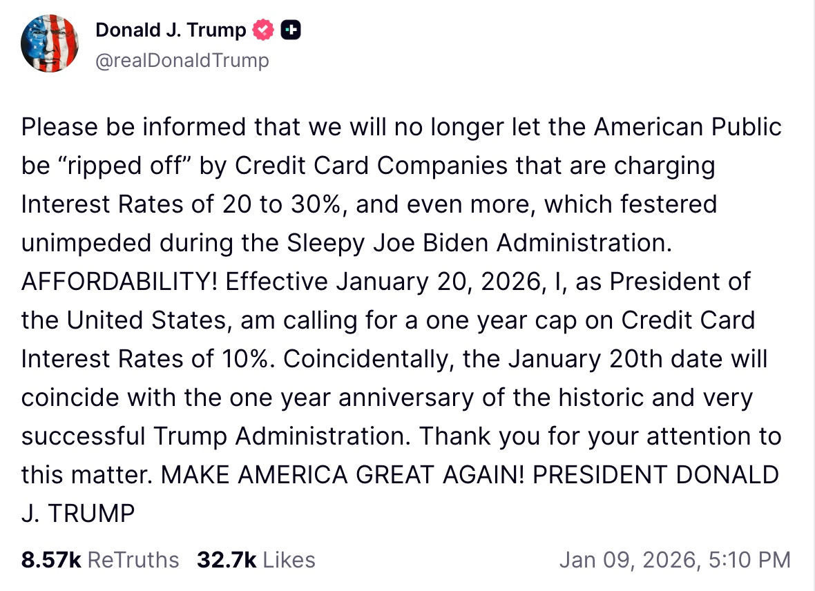 In a Truth Social post, Donald Trump stated that he would no longer allow Americans to be “ripped off” by credit card companies and banks charging excessive interest.