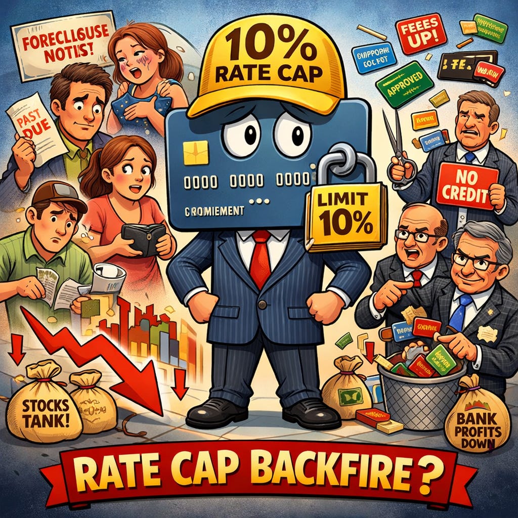 I believe the odds of a 10% credit card rate cap becoming law are low. The unintended consequences—tighter credit, fewer perks, and reduced access—would hurt the very consumers it aims to help.