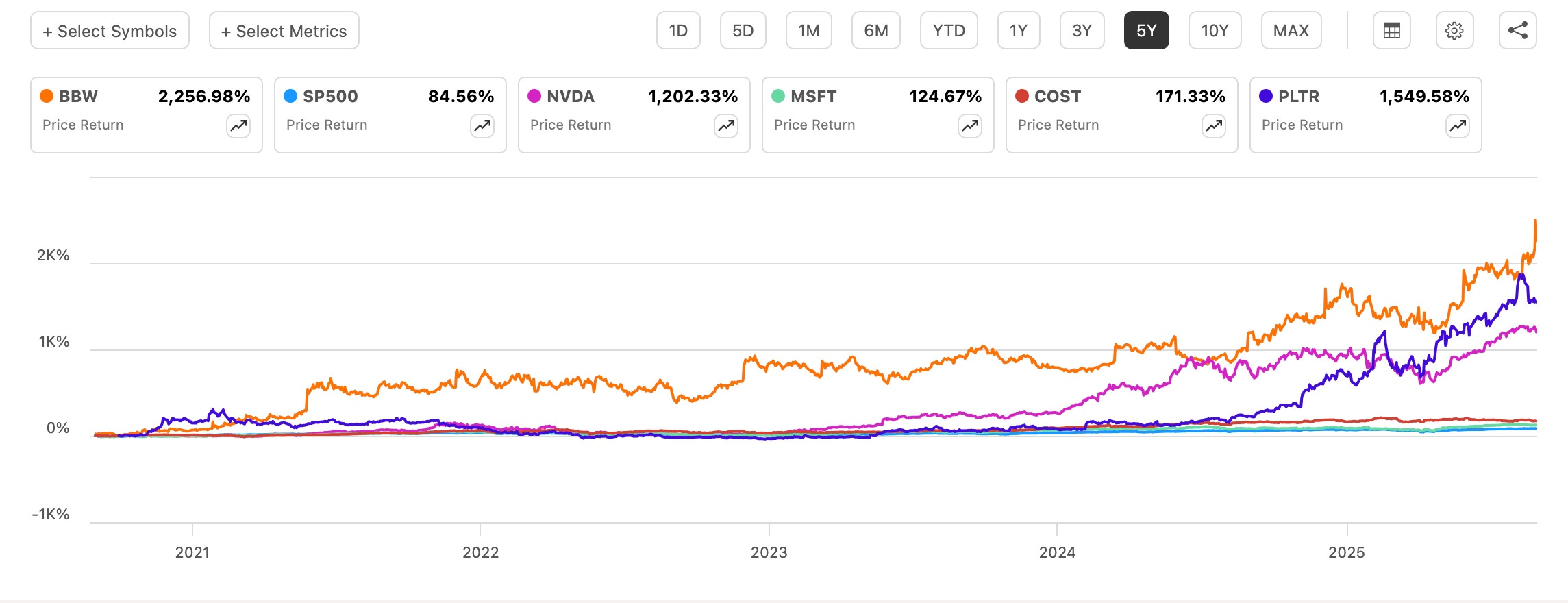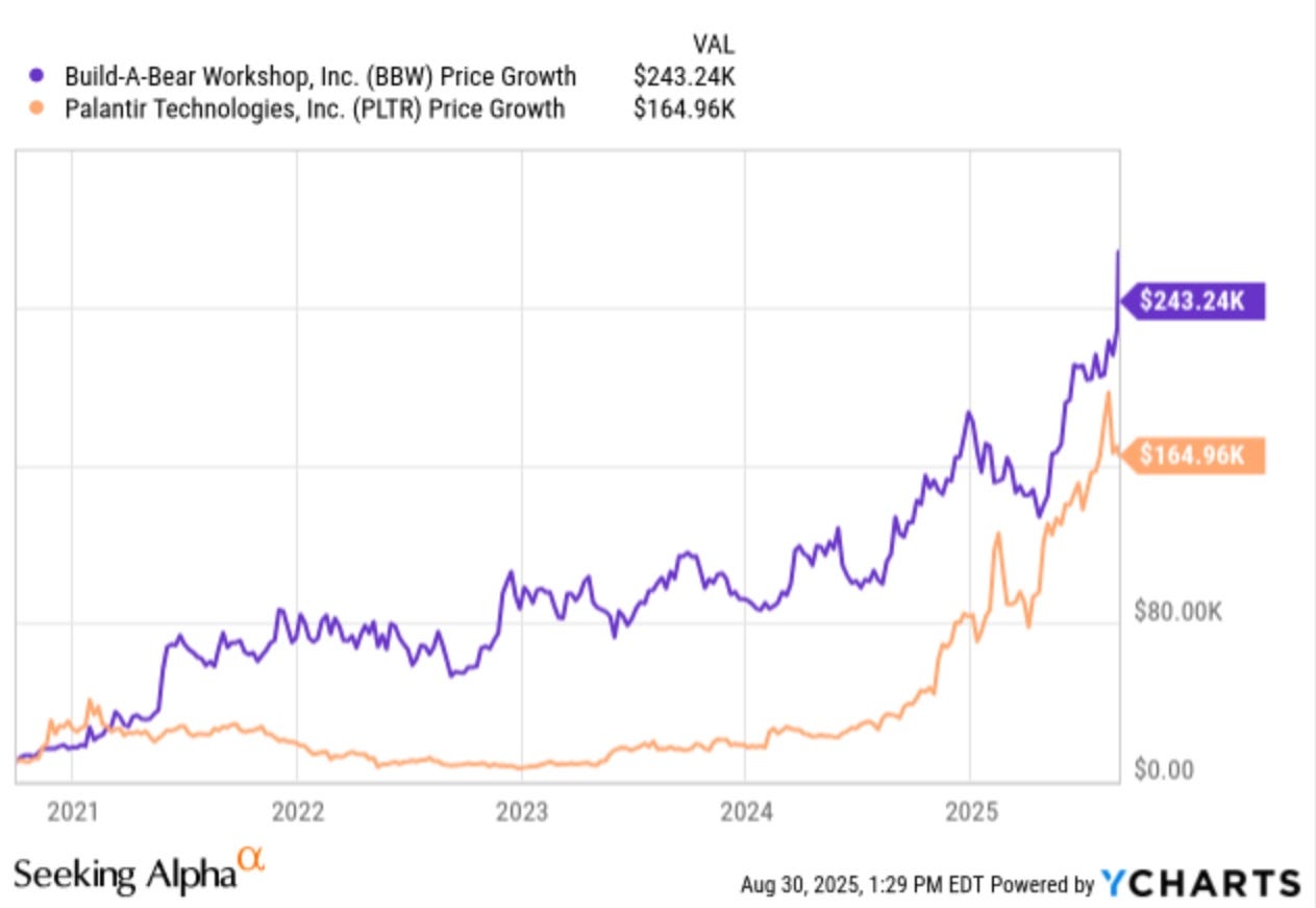 Investing $10k into the retailer would be worth over $243,000 compared to roughly $165,000 for Palantir today. So, while investors have been chasing stocks like Palantir, BBW has been quietly outperforming.