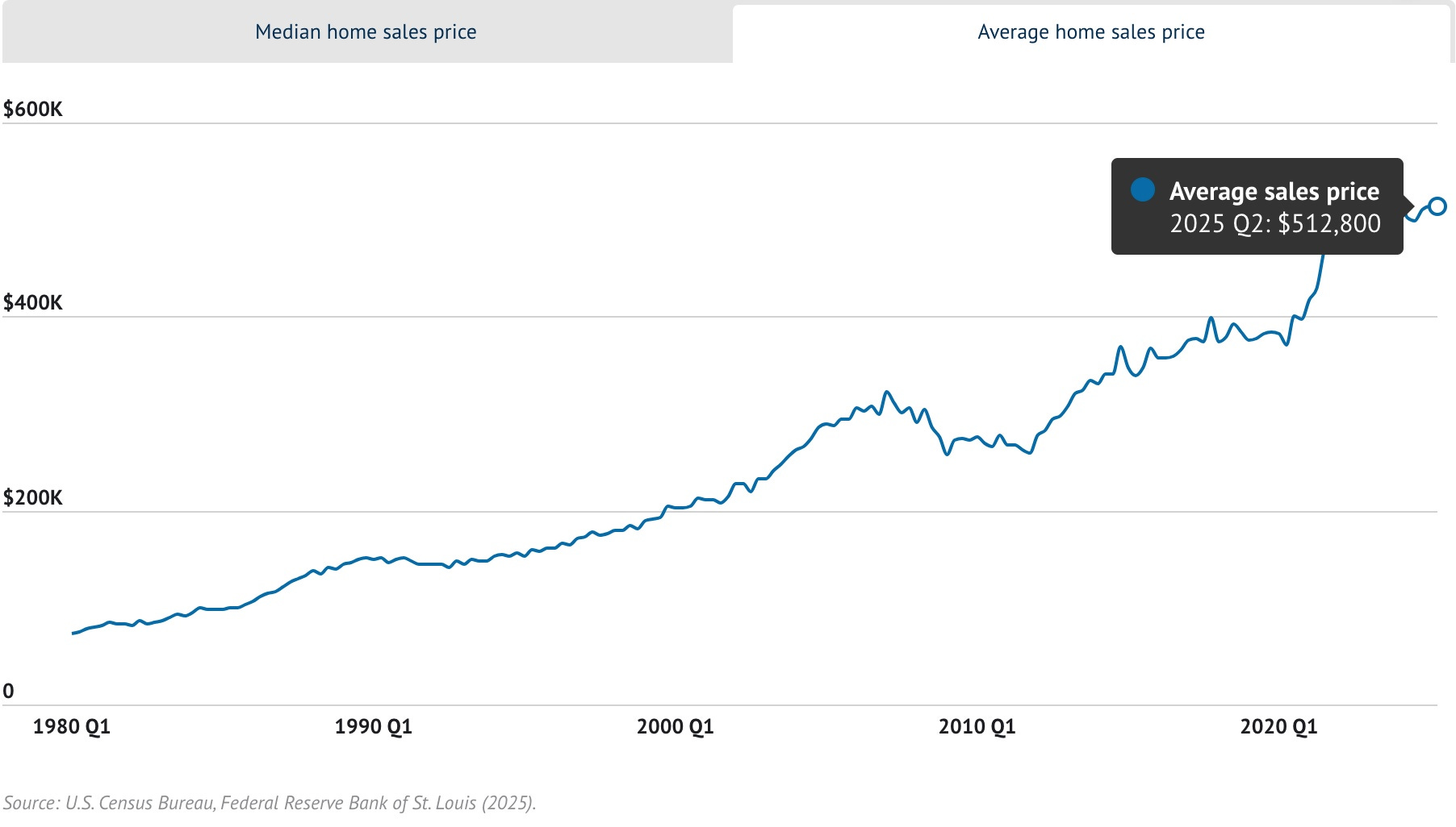Below is the cost to own a home in the U.S. from 1980 until now. In Q2’25, the average cost of a home was $512,800. Of course, in certain states this varies by location.